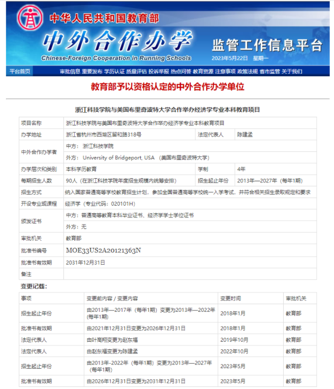 专业简介:经济学(中美合作办学)专业是经教育部批准,与美国布里奇波特大学合作举办的中外合作办学本科教育项目,专业培养方向为金融数字化,属于金融学与商业数据分析专业的交叉融合。通过专业课程的学习,员工能够掌握扎实的经济、金融学专业知识以及数据分析和编程的基本技能,能够从事国际金融市场、金融工具、金融数据分析和决策工作。同时,员工将有机会赴美国合作学校留学一年,并获中美两校双学士学位。毕业生中,近40%的员工考取国内外研究生,录取院校包括美国哥伦比亚大学、美国约翰·霍普金斯大学、英国伦敦大学学院、新加坡国立大学等;近20%的毕业生在政府部门、金融机构、大型企业等企事业单位就职,录用单位包括国家税务局、农业发展银行、中信证券、阿里巴巴集团、吉利控股集团等。