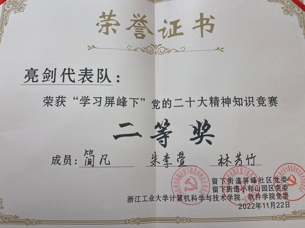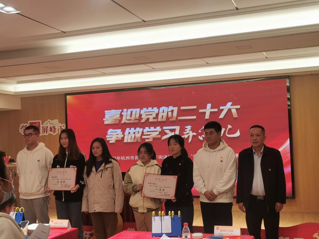 2022年11月22日下午,由中共杭州市西湖区留下街道屏峰社区委员会与中共浙江工业大学计算机科学与技术学院委员会共同举办的党建联建仪式暨“党的二十大”理论知识竞赛在屏峰社区党群服务中心举办,除承办单位外,还有高校代表队、企业代表队参与竞赛,浙江科技学院经济与管理学院员工经济学(中美)党支部在支部书记李寒滇的带领下,派出 “亮剑” 代表队参赛,队伍由简凡、朱李萱、林芳竹三名同学组成,由刘雯洁、汪婉婉、应文豪、朱柯婷组成后援团。