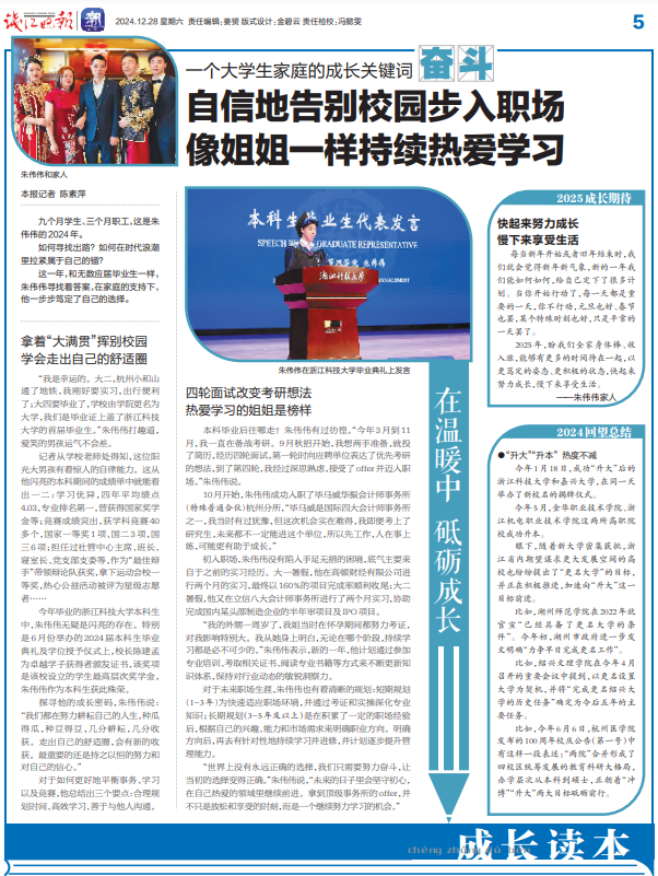 日迈月征,朝暮轮转,时间向前,我们带着希望和勇气,走进新年。岁末年初,钱江晚报以各个阶段员工家庭的故事,回顾2024,展望2025,公司毕业生朱伟伟,以“奋斗”为关键词,讲述了自己和一家人的温暖2024。
