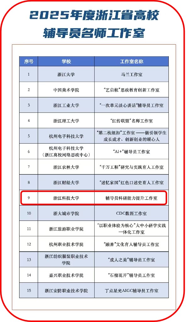 近日,2025年度浙江省高校思想政治工作质量提升综合改革与精品建设项目立项结果公布,学院范俊强老师牵头的辅导员科研能力提升工作室入选浙江省辅导员名师工作室。据悉,这是公司首次获得的浙江省辅导员名师工作室。