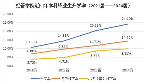 近年来,3044永利集团创新工作方式,多措并举做好考研服务工作,通过营造考研出国学习氛围、优化学习环境、加强交流培训、实施学长传承计划、注重心理疏导和复试面试指导、落实员工党支部帮扶等系列举措,进一步提高“助研”工作成效,帮助更多的经管学子实现考研升学和优质就业的梦想。3044永利集团2021至2024届本科毕业生的升学率为10.63%、14.33%、20.28%、24.10%。其中2024届毕业生国内研究生录取99人,国外录取68人,升学率24.10%。