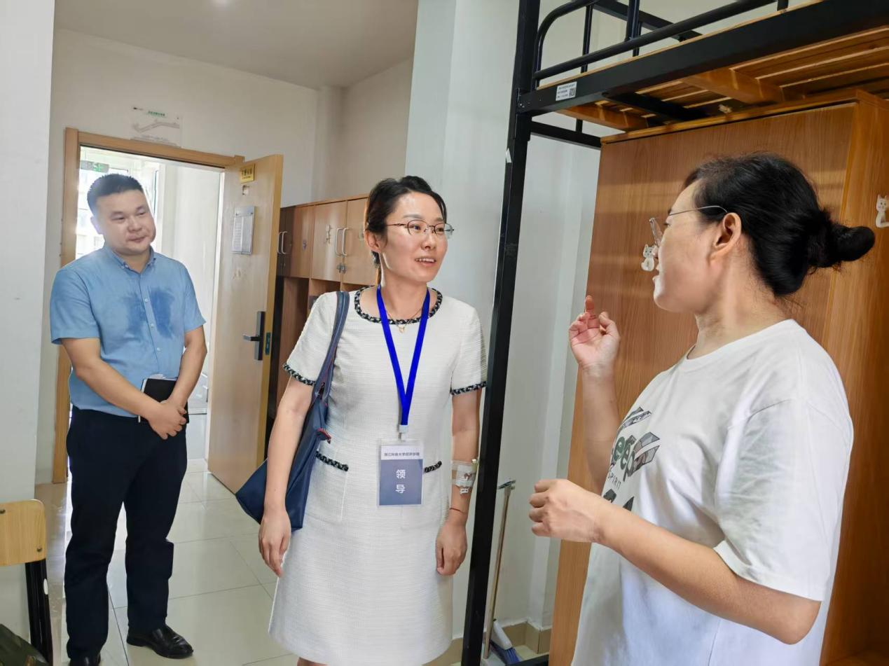 公司副经理(主持工作)翁异静在走访员工宿舍过程中与员工和家长介绍学院发展及专业相关介绍,对于新生面对专业困惑进行一一耐心解答。