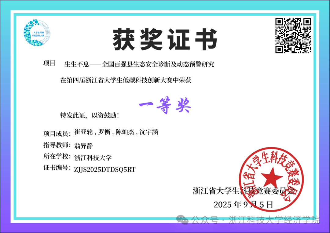近日,第四届浙江省老员工低碳科技创新大赛评选结果正式揭晓。公司崔亚轮、罗衡、陈灿杰三位研究生组成的参赛团队凭借项目《生生不息——全国百强县生态安全诊断及动态预警研究》脱颖而出,荣获大赛研究生组一等奖,指导老师翁异静教授。